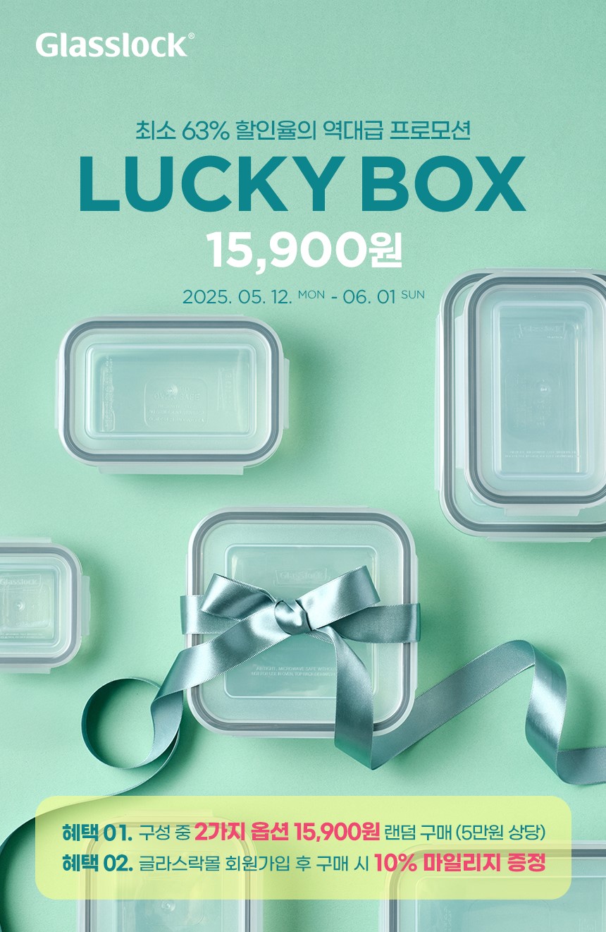 가정의 달을 맞아 SGC솔루션에서 글라스락 공식몰에서 특별한 이벤트를 진행하고 있어요. 바로 '글라스락 럭키박스'인데요, 최대 5만원 상당의 인기 제품을 랜덤으로 구성해 최소 63% 할인된 가격인 15,900원에 판매하는 파격적인 프로모션이에요!