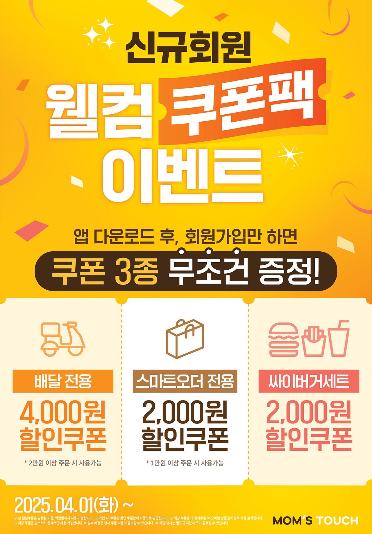 | 땡겨요(배달앱) | 치킨·버거 단품 등 | 랜덤쿠폰 1,000~2,000원 | 쿠폰 발급 후 맘스터치 단품 주문 시 적용 |