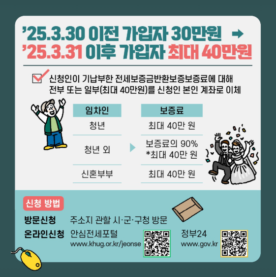 | 신혼부부 (혼인 7년 이내) | 보증료 100% (최대 30만원) | 신혼이면 전액 지원! |