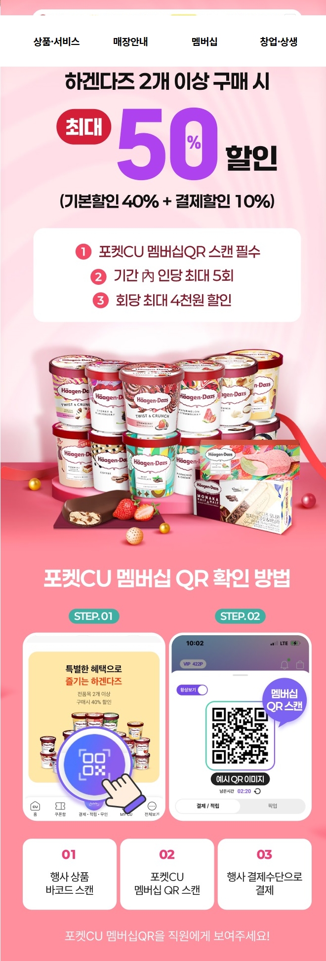 | CU | 하겐다즈 2개↑ 50% 할인 | BC/농협카드, 카카오페이머니 등 | 인당 5회, 우주패스 병행 |