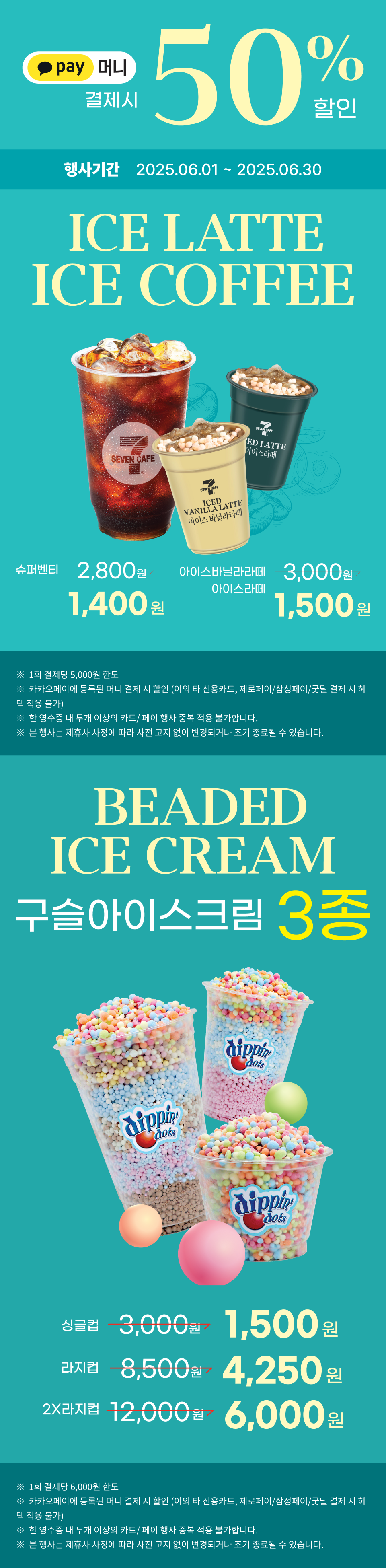 | 세븐일레븐 | 구슬아이스크림 50% 할인 | 1,500원 | 750원 | 카카오페이머니, 1개씩 결제 무한 적용 |
